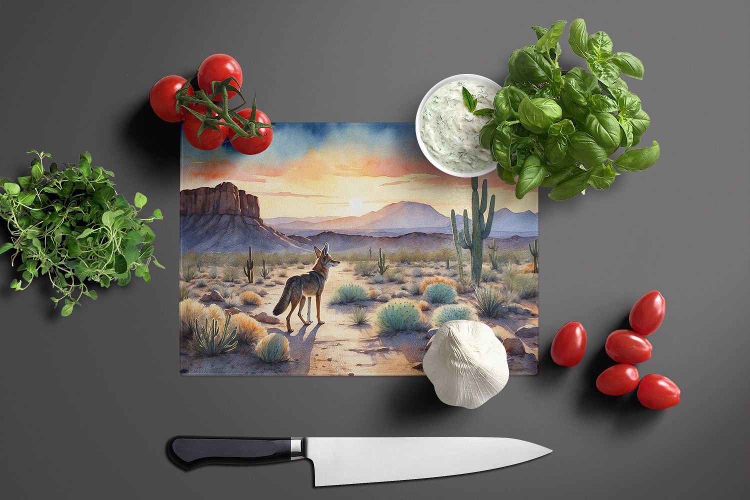 Home > Desert Sunset Coyote Glass Cutting Board Decorative Tempered Glass Kitchen Cutting and Serving Board Large Size Chopping Board