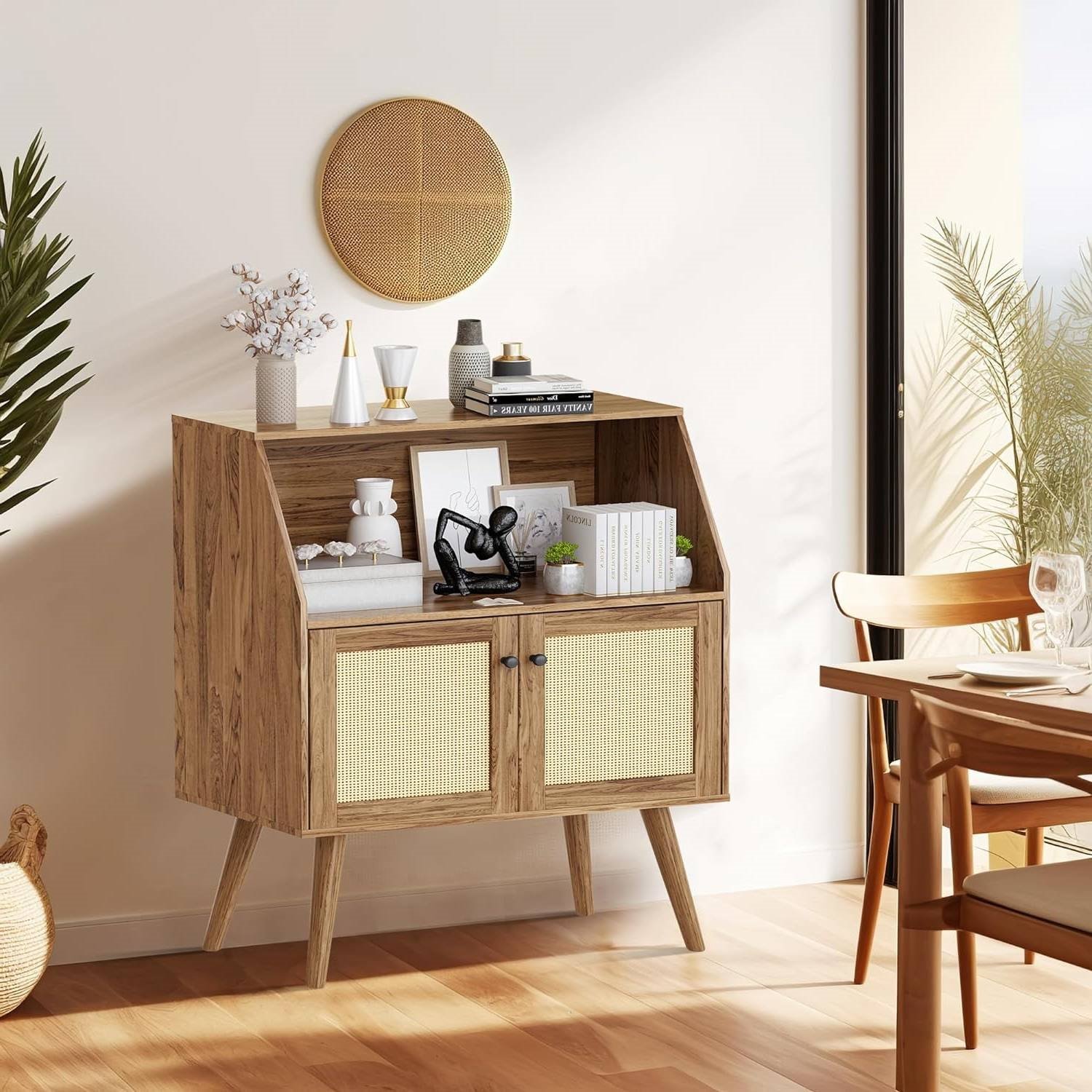 • The sideboard cabinet features classic rattan panels in a Black frame. It adopts natural rattan with handmade weaving technology, the natural rattan not only has the effect of absorbing moisture and heat but also delivering perfect visual effect, add a boho chic vibe to your home.