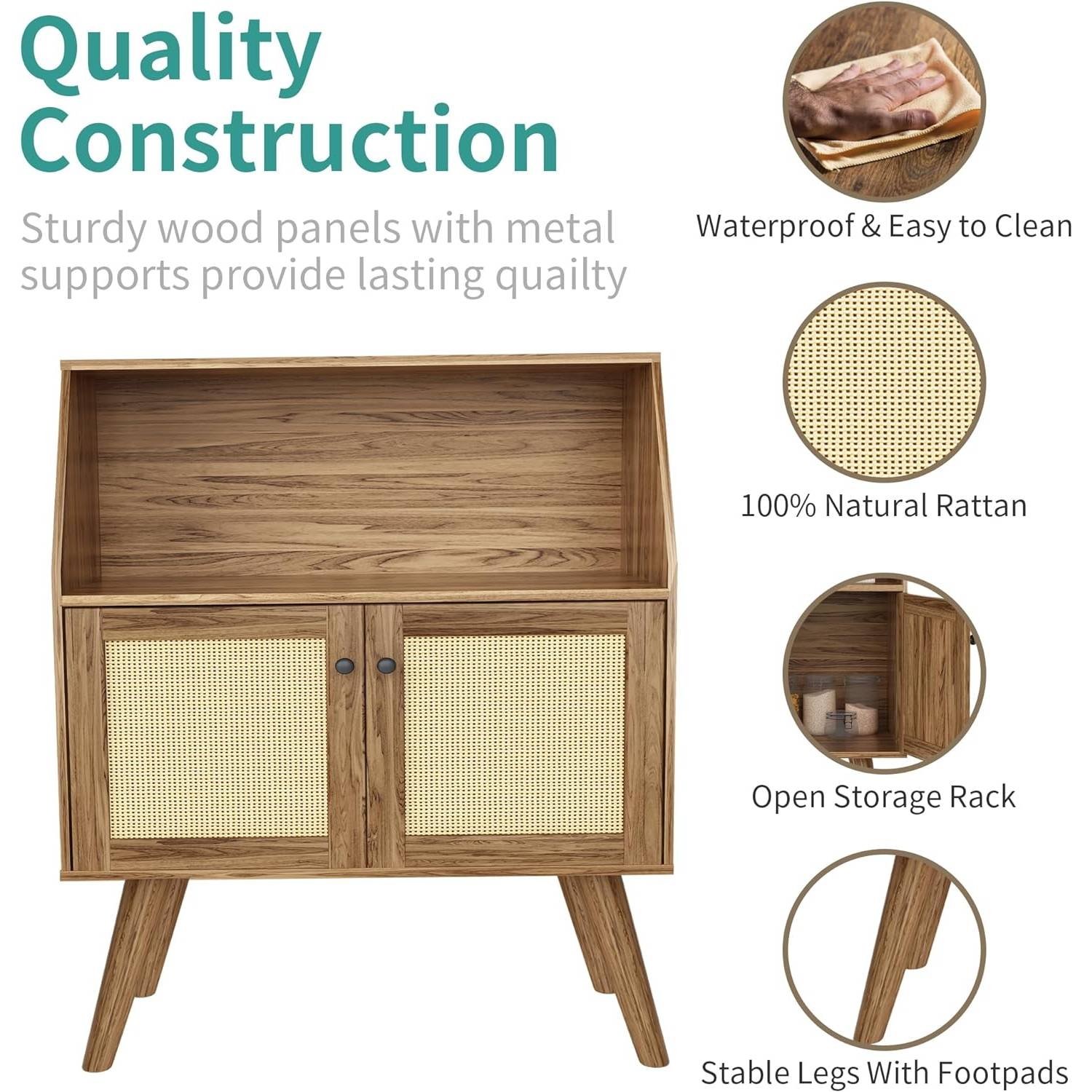 The Mid-Century Modern Buffet Cabinet Sideboard Table in Walnut Wood Finish is made of natural rattan, high-quality MDF board and superior iron, which has good load-bearing and stability. The issue of service life is no longer something you need to worry about. The perfect boho decor, If you put it in the dining room, living room, bedroom, hallway or bathroom,will bring a warm, natural feeling. Each package contains detailed installation instructions, and this Sideboard Buffet Cabinet consists of only a few parts, you can get a perfect Cabinet in no more than 25 minutes.