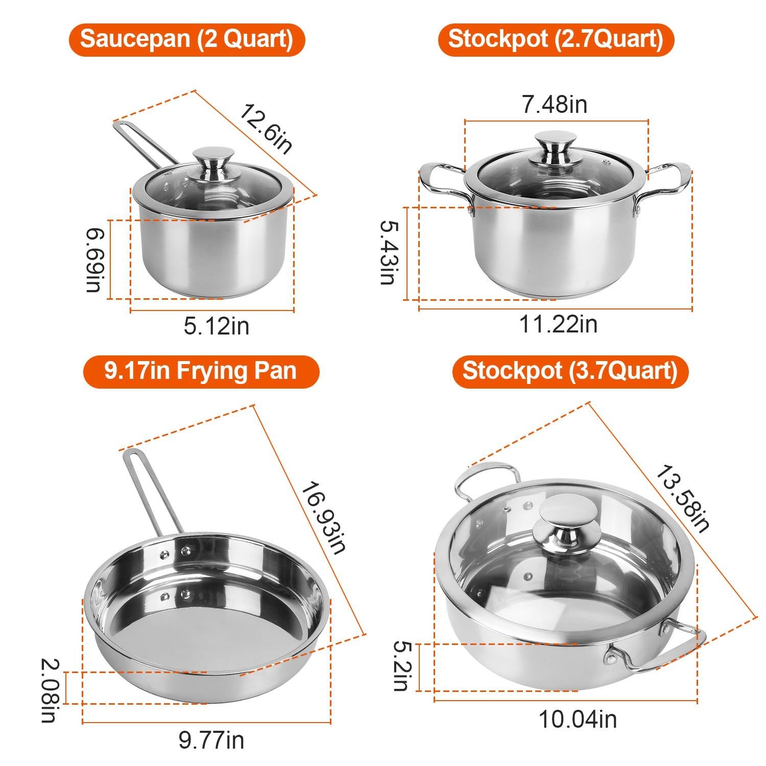 **Complete Cookware Set*:This pots and pans set includes 3.7-quart stockpot with lid; 2.7-quart stockpot with lid; 9.17in frying pan; 2 quart saucepan with lid. You get all the cooking essentials in just one package with this induction cookware pots and pans set; which can meet your various demands of everyday cooking for you and your family.
