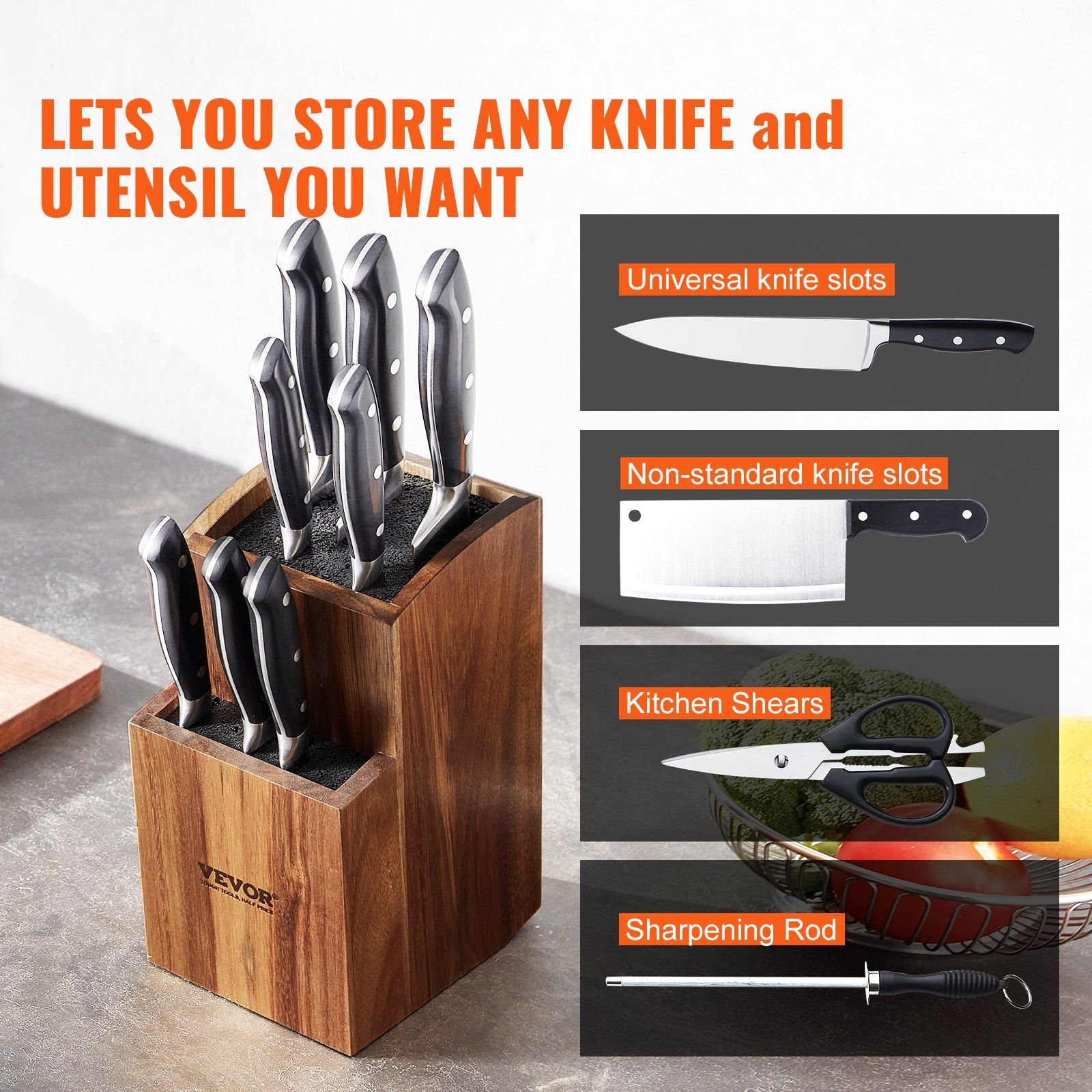 Home > VEVOR Universal Knife Holder, Acacia Wood Knife Block Without Knives, Two-Tier Knife Storage Stand with PP Brush