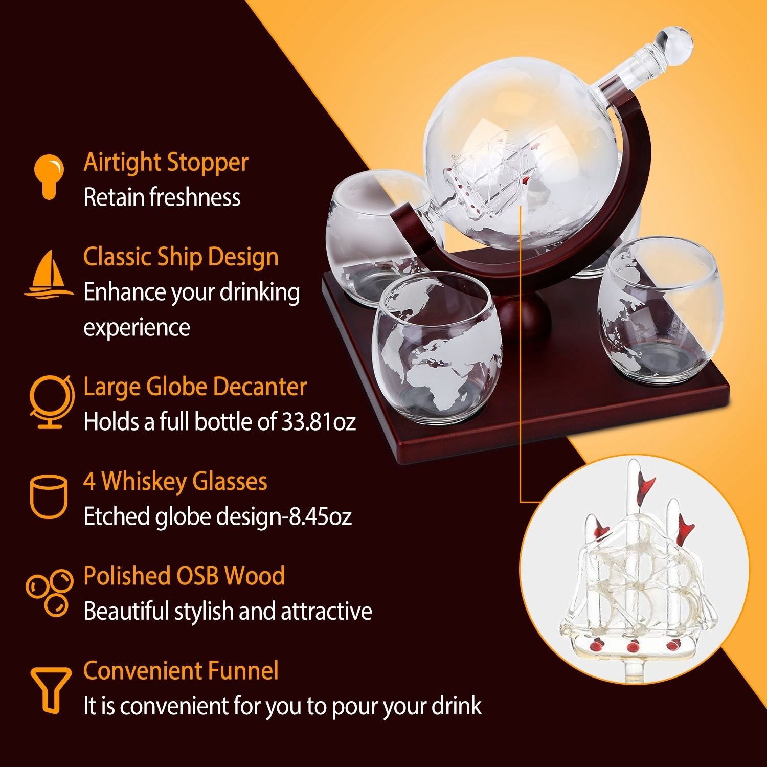 *Beautiful Decoration*:Unique complete elegant whiskey decanter set; includes an globe design decanter and unique antique ship inside; accompanied by four matching classic glasses masterly and a OSB wooden tray; which can perfectly decorate your home or enhance your bar.